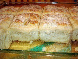 Mix bisquick, sour cream and 7 up. Dough will be very soft – don’t worry Knead and fold dough until coated with your baking mix. Pat dough out and cut biscuits using a round biscuit / cookie cutter. Melt butter in bottom of cookie sheet pan or 9×13 casserole dish. Place biscuits on top of melted butter and bake for 12-15 minutes or until brown at 425 degrees,